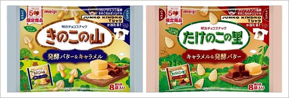 明治は、「きのこの山」「たけのこの里」からデザイナーのコシノジュンコ氏とのコラボ「きのこの山発酵バター&キャラメル」(96g)、「たけのこの里キャラメル&発酵バター」(88g)の2品を期間限定で、2025年10月14日に全国(CVSと駅売店は除く)で発売した。香り高くコク深い発酵バターとキャラメルを合わせたチョコに、サクサクで軽い食感のクラッカーとクッキーをそれぞれ合わせて上質な味わいに仕上げている。
